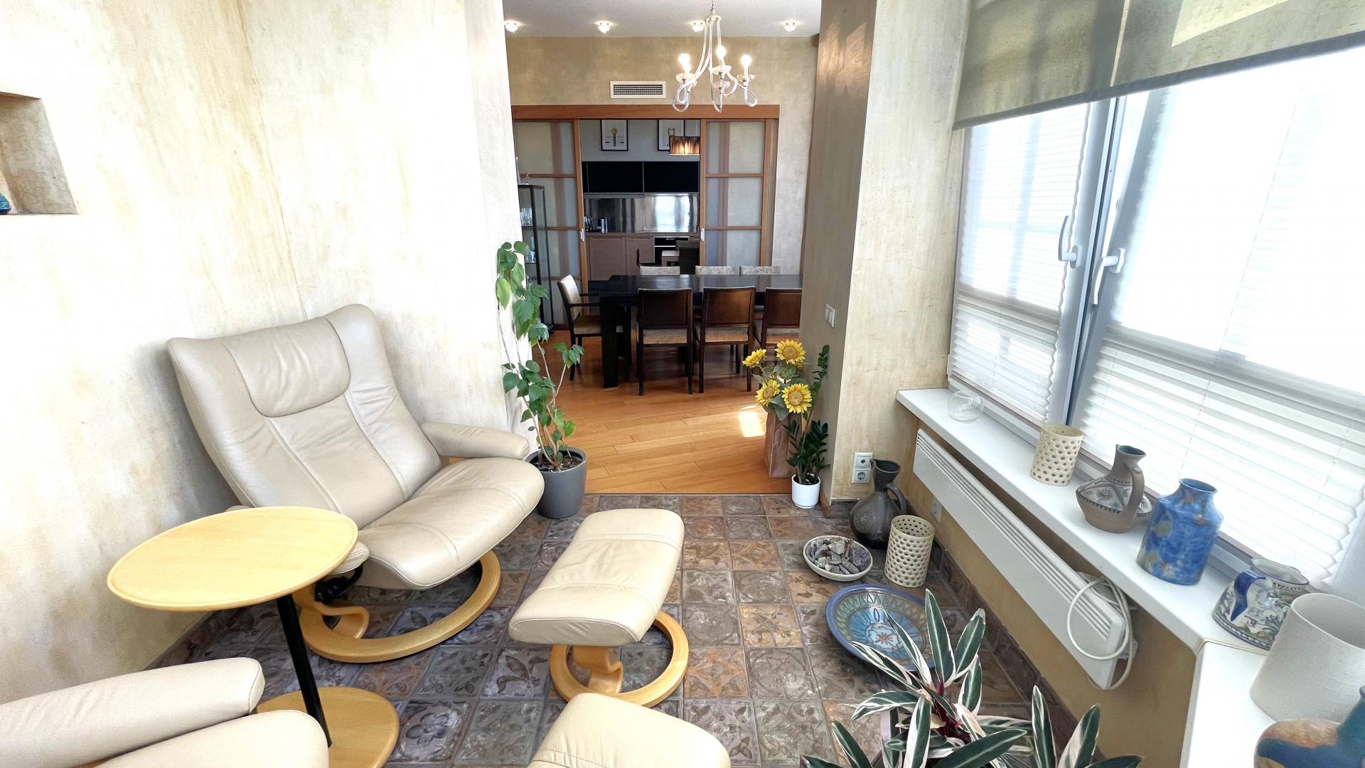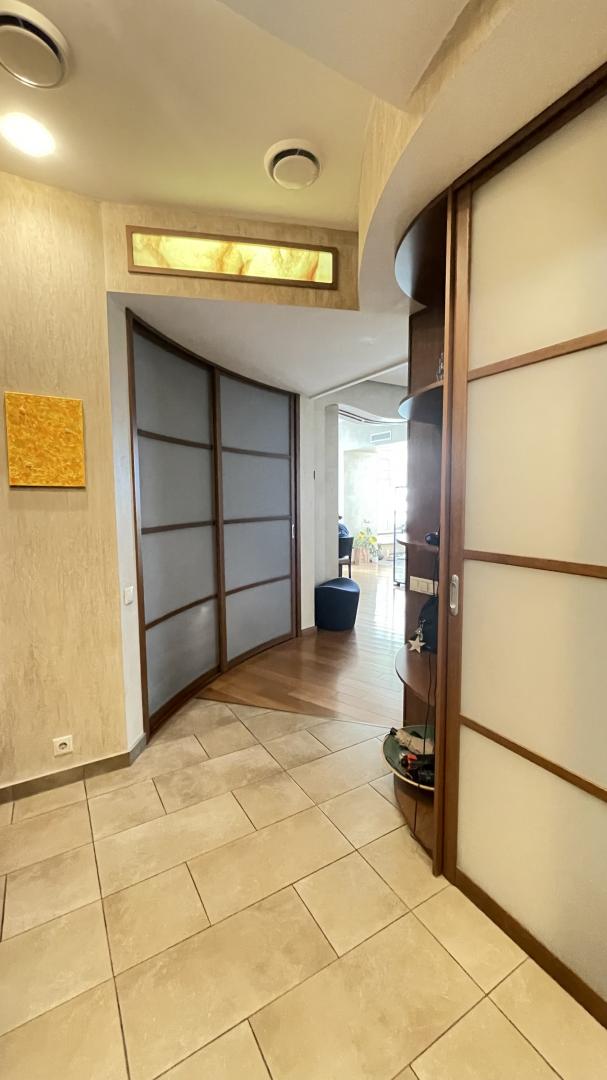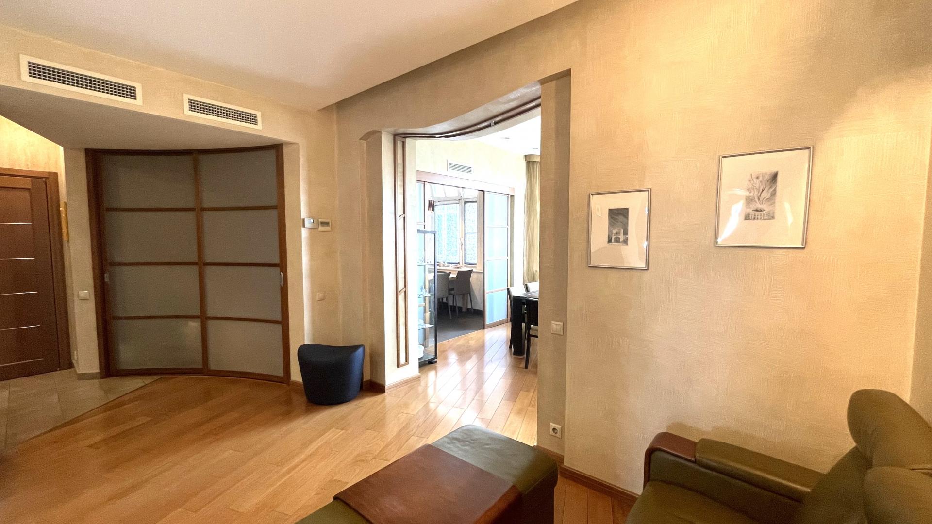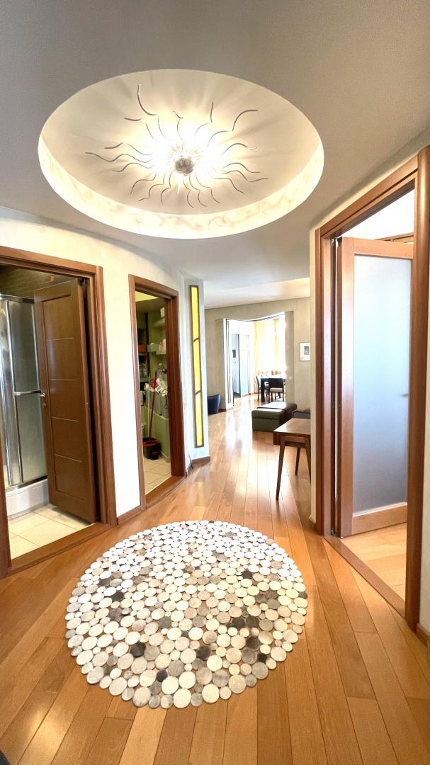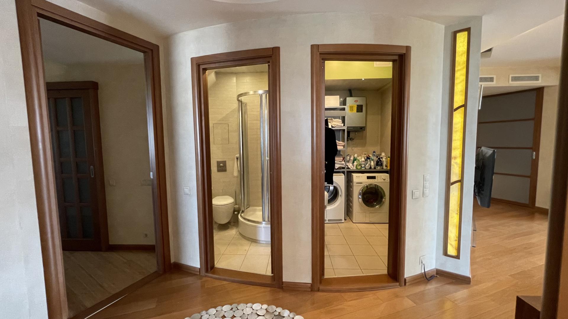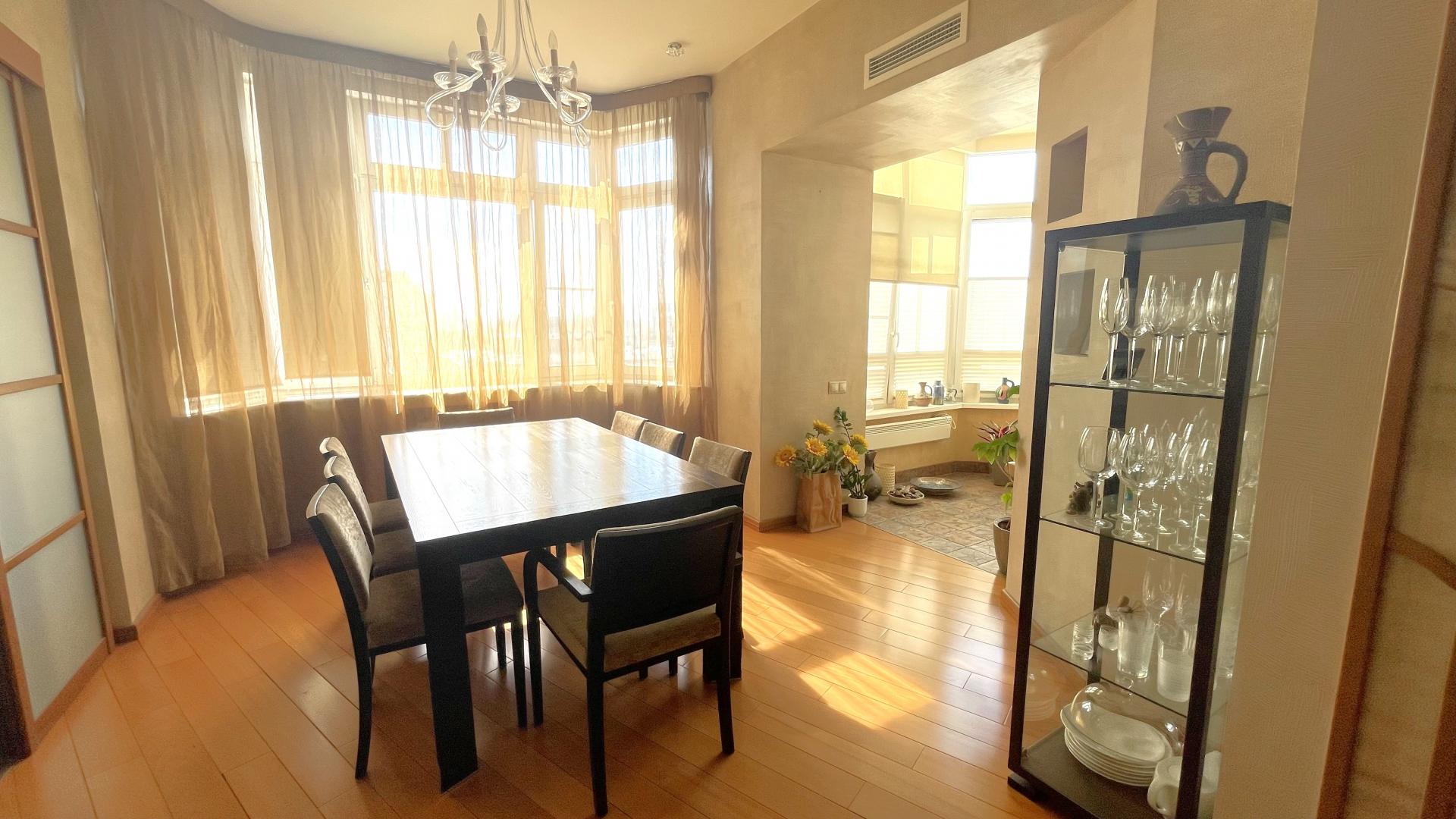 В квартире выполнен высококачественный дизайнерский ремонт. Функциональная планировка: кухня-столовая-гостиная 35 кв м плюс большая лоджия (зона готовки отделена от столовой раздвижной дверью, что позволяет зонировать пространство или сделать его единым) , 4 ИЗОЛИРОВАННЫЕ КОМНАТЫ: мастер-спальня с собственным сан/узлом, вторая спальня с большой лоджией, третья комната и небольшой кабинет (гостевая комната или небольшая детская), просторный холл (можно использовать в качестве второй маленькой гостиной или как кинозал). В квартире три сан/узла, большая постирочная-кладовка (техническая комната со стиральной и сушильной машиной и местами для хранения), просторная прихожая с двумя очень вместительными встроенными шкафами. Реальная площадь квартиры с лоджиями 162 кв.м.