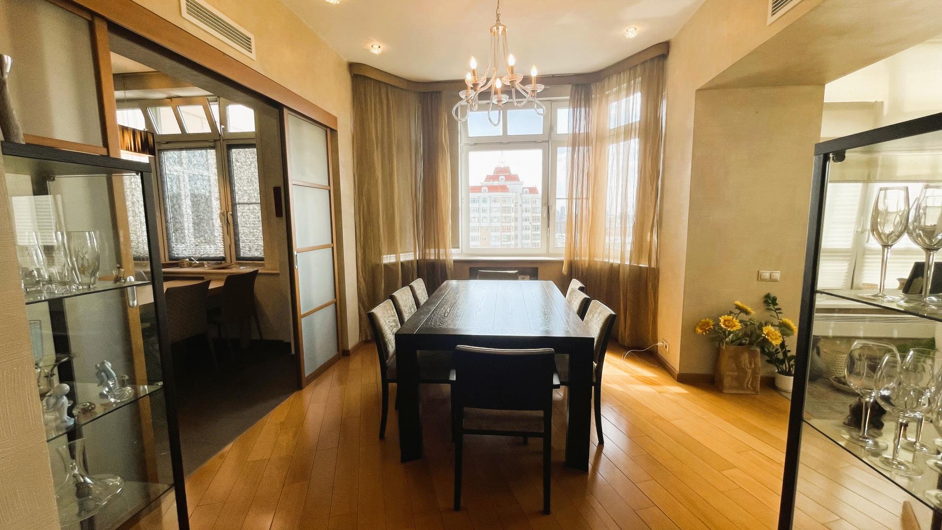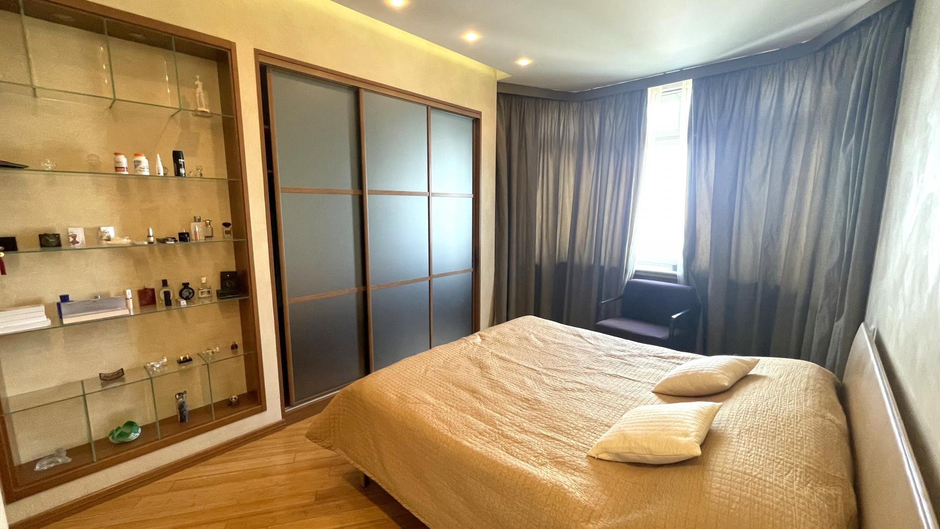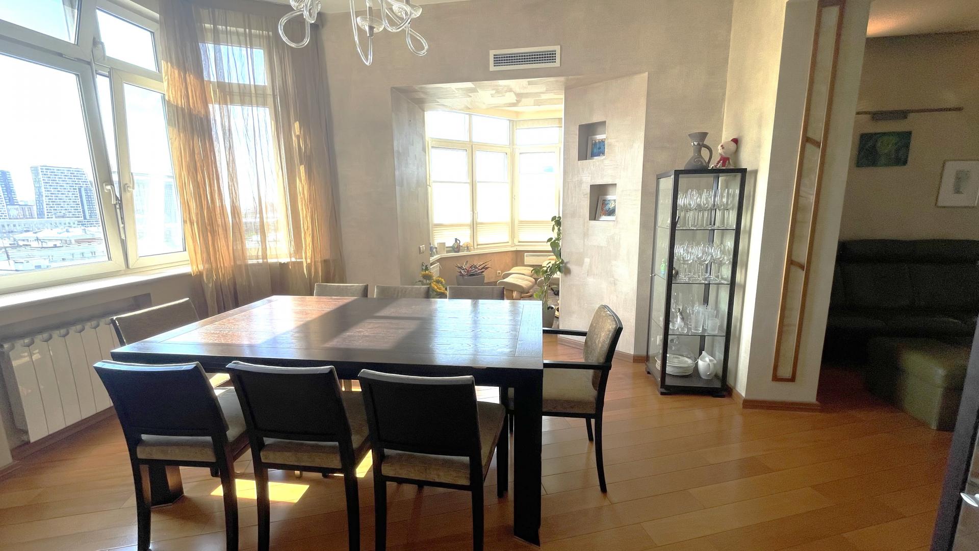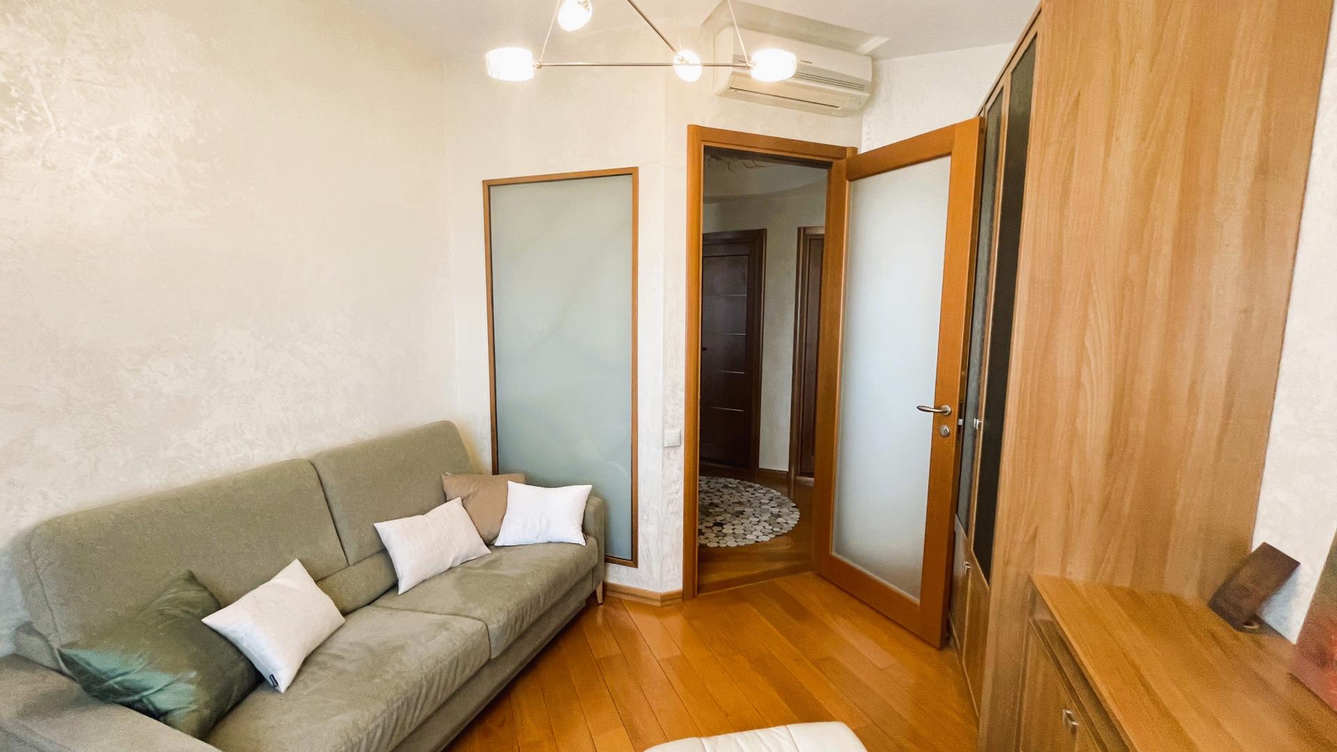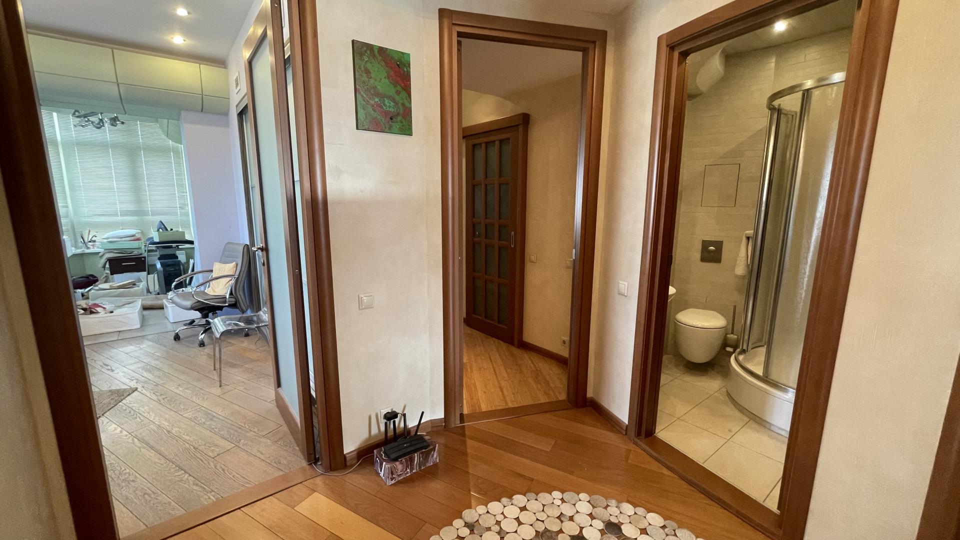 В квартире выполнен высококачественный дизайнерский ремонт. Функциональная планировка: кухня-столовая-гостиная 35 кв м плюс большая лоджия (зона готовки отделена от столовой раздвижной дверью, что позволяет зонировать пространство или сделать его единым) , 4 ИЗОЛИРОВАННЫЕ КОМНАТЫ: мастер-спальня с собственным сан/узлом, вторая спальня с большой лоджией, третья комната и небольшой кабинет (гостевая комната или небольшая детская), просторный холл (можно использовать в качестве второй маленькой гостиной или как кинозал). В квартире три сан/узла, большая постирочная-кладовка (техническая комната со стиральной и сушильной машиной и местами для хранения), просторная прихожая с двумя очень вместительными встроенными шкафами. Реальная площадь квартиры с лоджиями 162 кв.м.