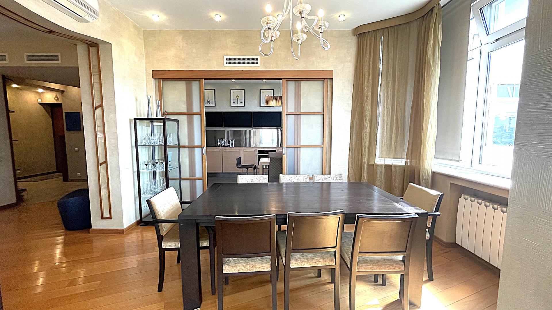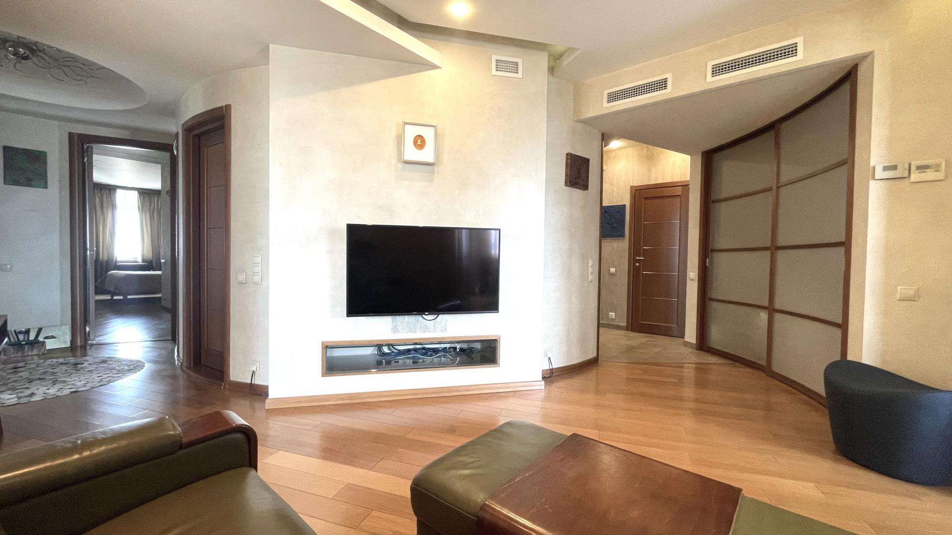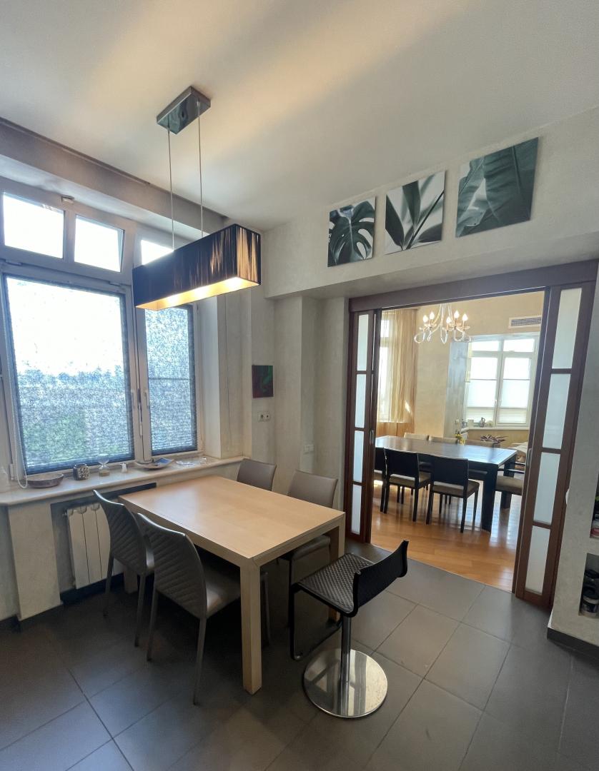 Кухня Varenna Poliform (Италия), техника Kuppersbusch, Liebherr, кондиционеры Mitsubishi. Мраморные подоконники. Стены - венецианская штукатурка, пол - натуральное дерево, нестандартные большие межкомнатные двери. В квартире установлена система кондиционирования и система увлажнения воздуха. Высокие потолки 3,1м. На лестничной площадке предусмотрена специальная комната для хранения колясок, велосипедов, самокатов и др. вещей.