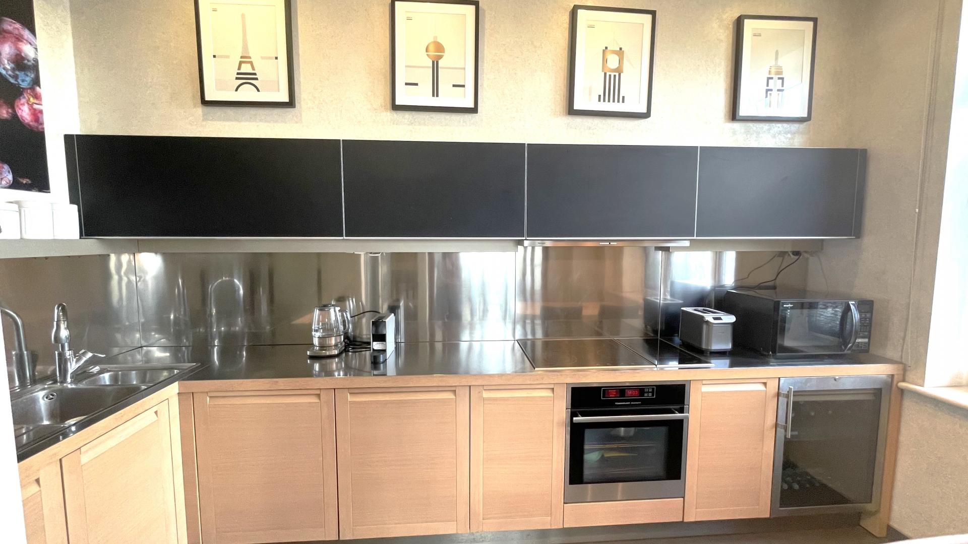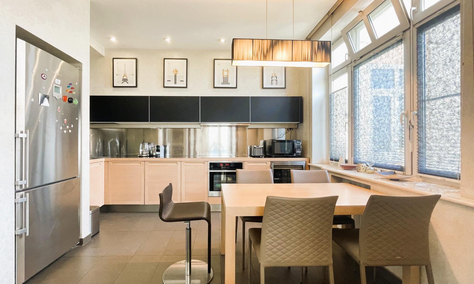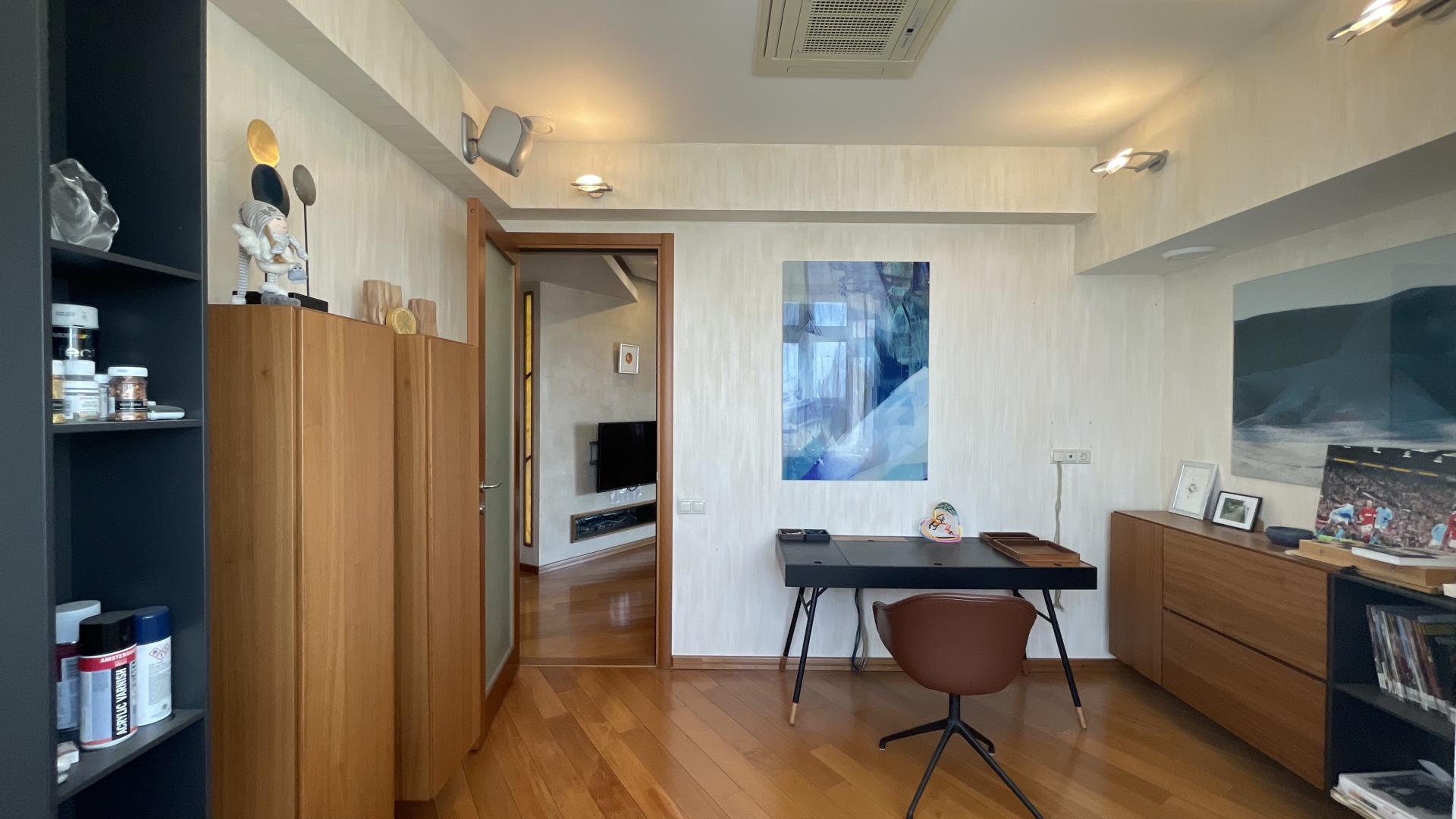 Кухня Varenna Poliform (Италия), техника Kuppersbusch, Liebherr, кондиционеры Mitsubishi. Мраморные подоконники. Стены - венецианская штукатурка, пол - натуральное дерево, нестандартные большие межкомнатные двери. В квартире установлена система кондиционирования и система увлажнения воздуха. Высокие потолки 3,1м. На лестничной площадке предусмотрена специальная комната для хранения колясок, велосипедов, самокатов и др. вещей.