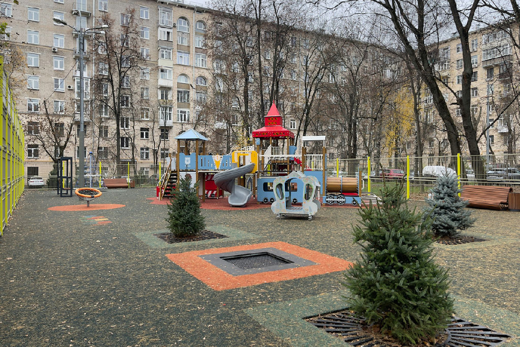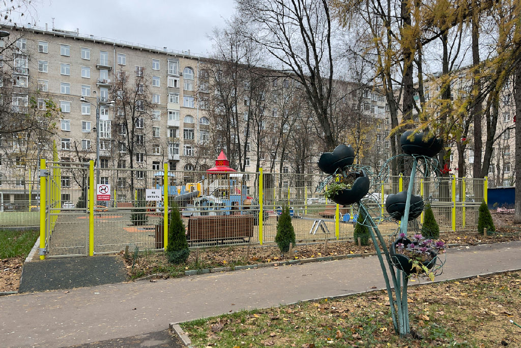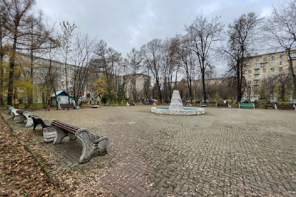 Во дворе особая атмосфера -действующий фонтан , футбольная площадка, растут сосны и лиственницы.