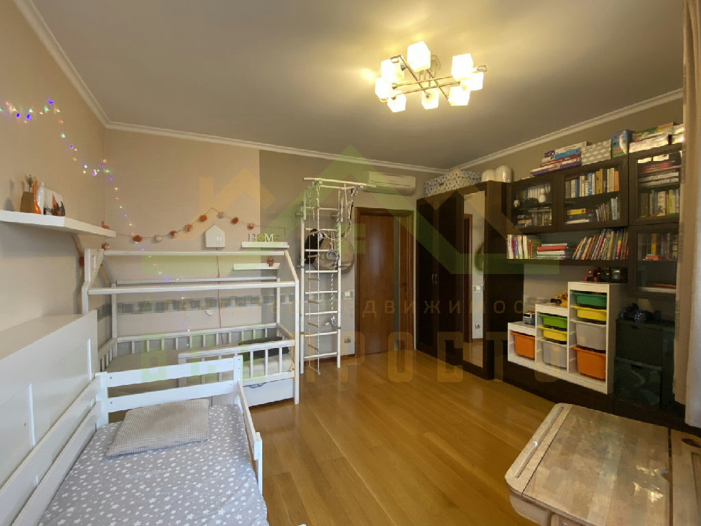 - кухня-гостиная площадью 38 кв.м, спальня и детская комнаты по 18 кв.м, комната 11,2 кв.м, кабинет 10 кв.м, гардеробная 7 кв.м, кладовая, 2 санузла и душевая, просторные прихожая и холл, две застекленные лоджии