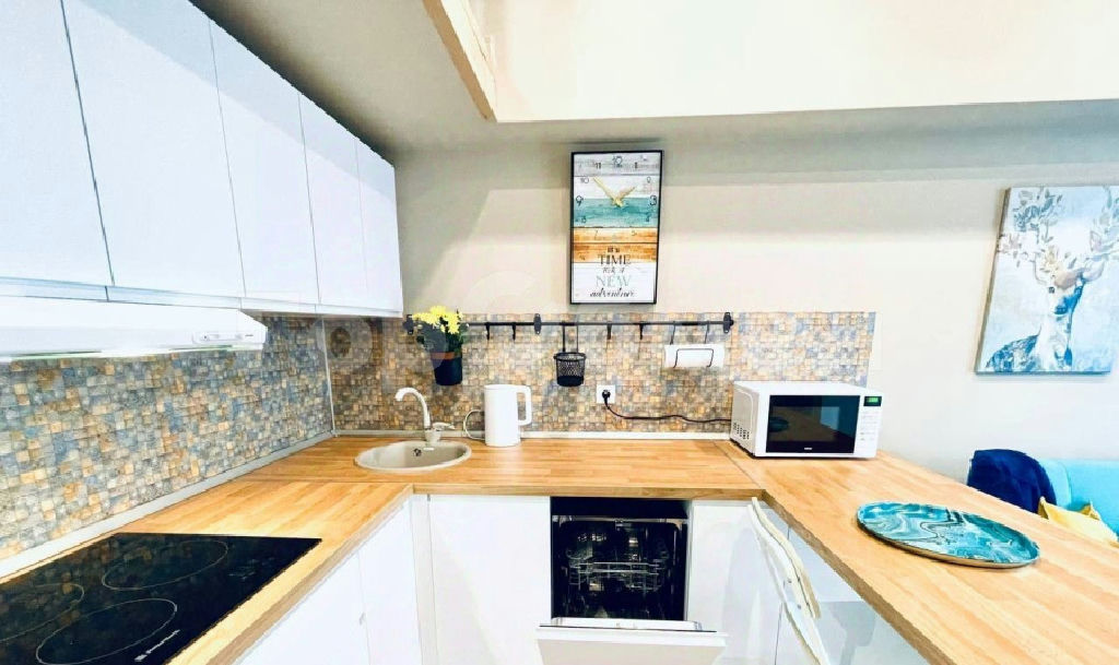 Студия оборудована всем необходимым для жизни, в том числе стиральной и посудомоечной машиной, большой варочной поверхностью, чайником, микроволновкой, пылесосом, телевизором, хорошей вытяжкой.
