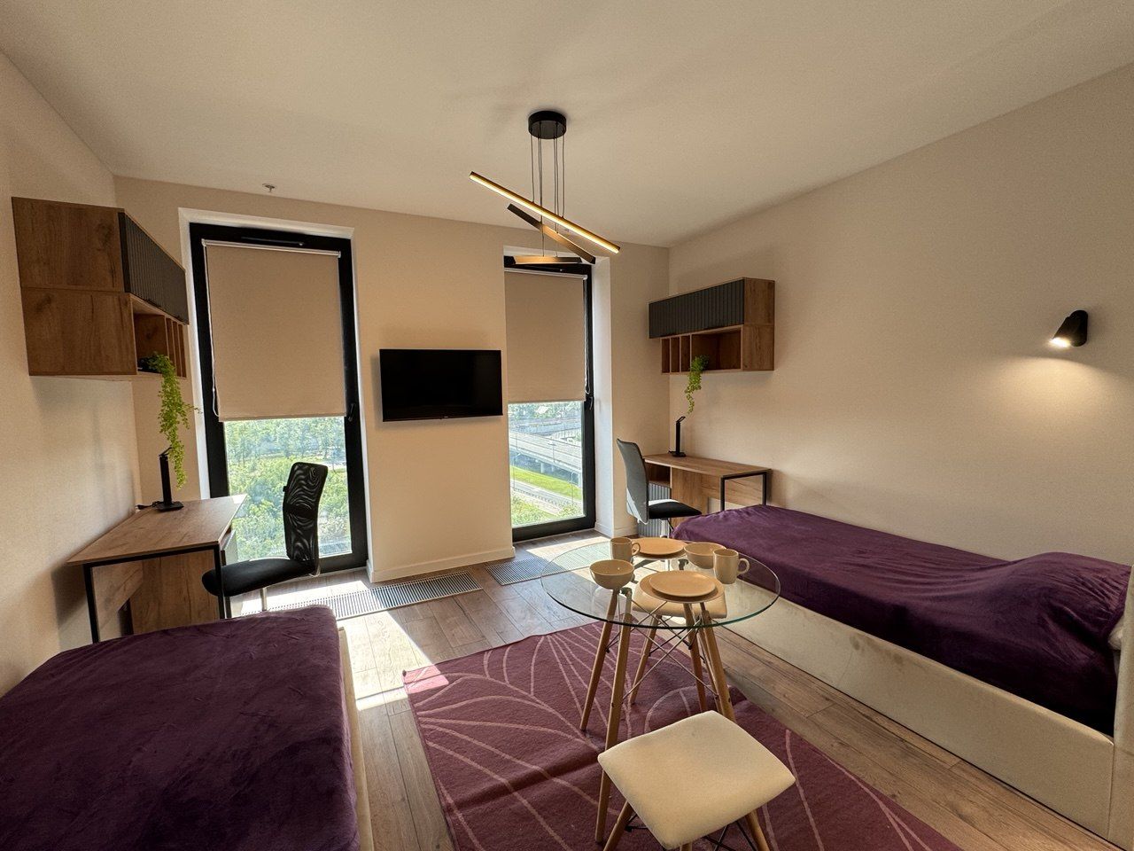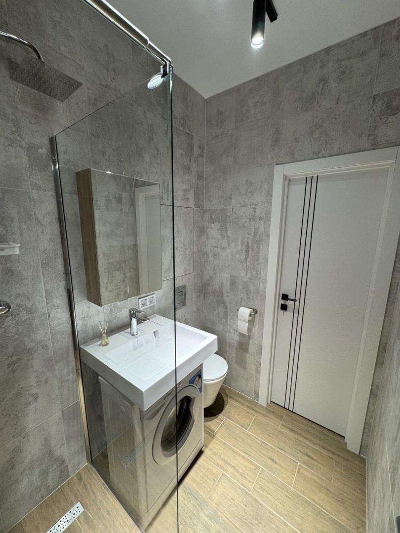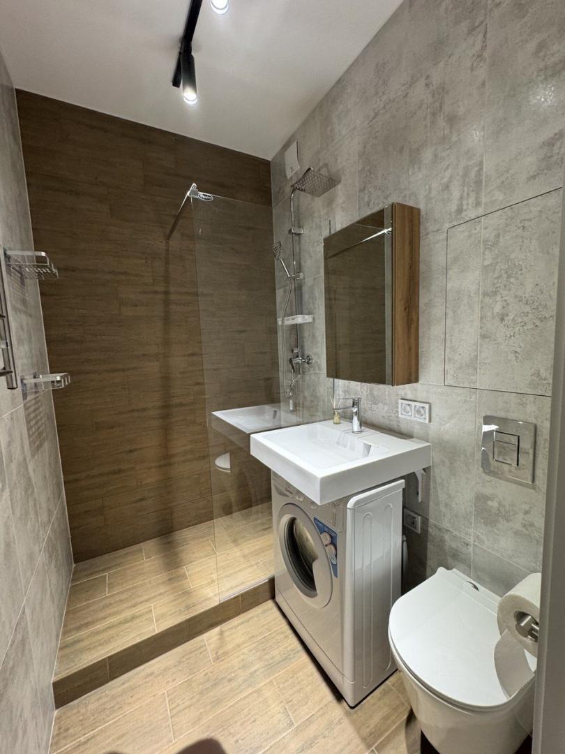 Апартаменты оформлены в дизайнерском стиле. В комнате есть вся необходимая мебель, а на кухне установлена современная техника: холодильник и стиральная машина. Ванная комната оборудована душевой кабиной.