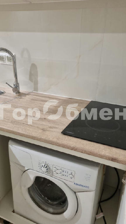 Кухонная зона, с интегрированными бытовыми приборами: варочной поверхностью, холодильником и стиральной машиной.