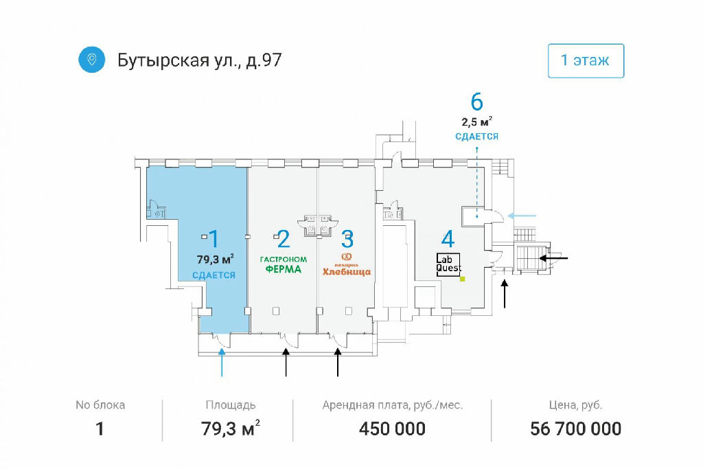 Арендная плата в месяц: коммунальные платежи и электричество оплачиваются арендатором отдельно Срок аренды: долгосрочный договор Размер ежегодной индексации, арендных каникул и страхового депозита обсуждаются