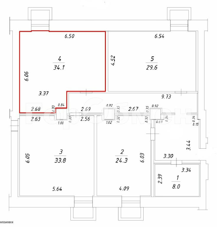 Площадь 34,1 кв.м, ( 4 на плане), офисная отделка, полноценное окно. В помещении все коммуникации, можно организовать свой санузел.