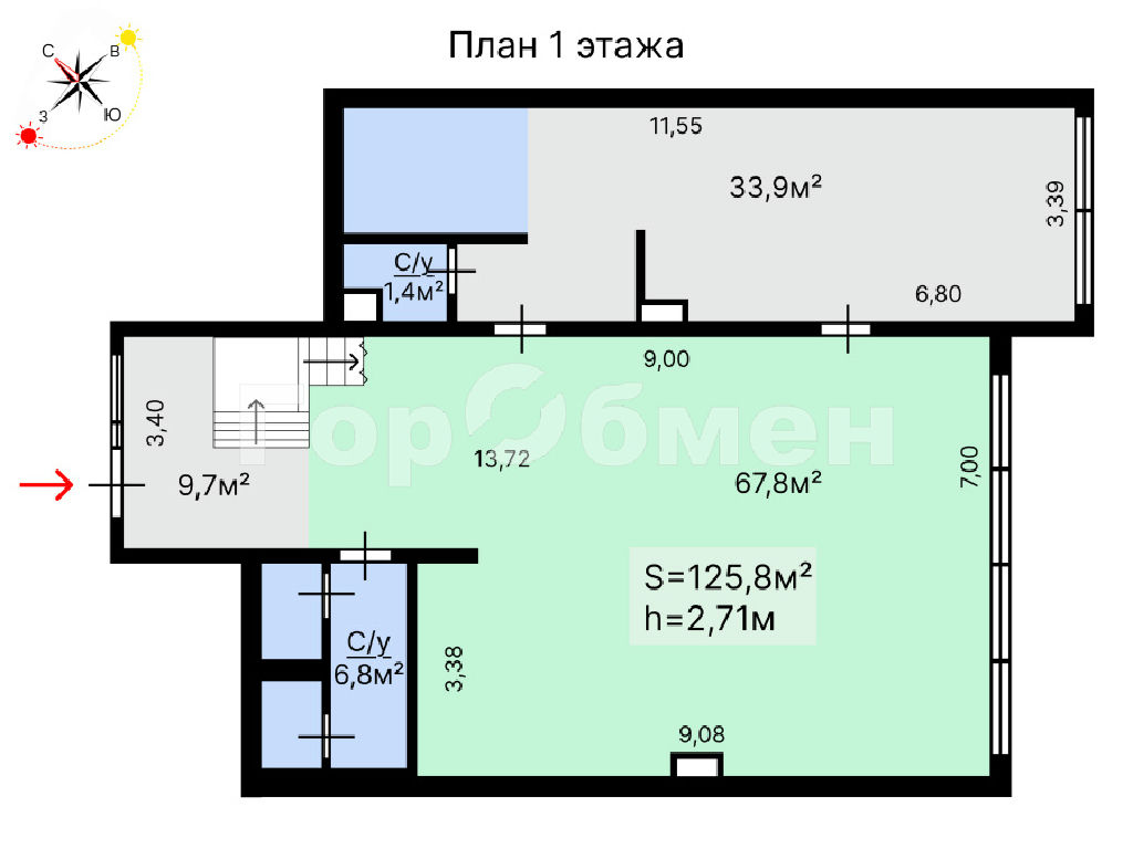 1. Основное помещение (219 м2): * 1 этаж (125,8 м2): Витринный вход с улицы, зона ресепшен и просторный светлый зал (высота 2,7 м) с видом во внутренний двор.
