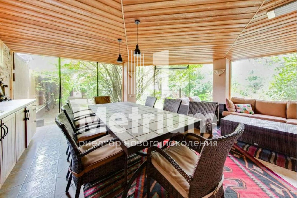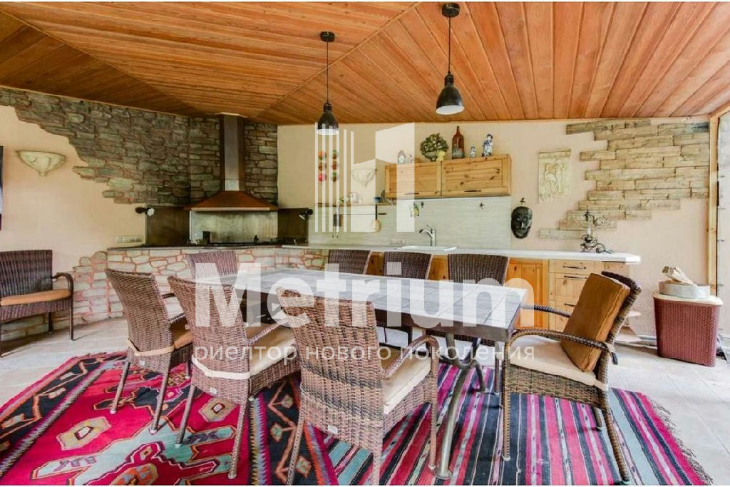 На участке расположены 2 постройки - дом 440 м кв ( ИЖС) и летняя беседка 36 м кв. Все постройки из кирпича, кровля из натуральной немецкой черепицы Braas. Беседка имеет барбекю c медной вытяжкой, большой стол на 12 человек и мягкую большую зону. К строению подведены коммуникации- есть вода и электричество. За беседкой имеется подсобное помещение для хранения инвентаря, закрывающееся автоматическими жалюзями.